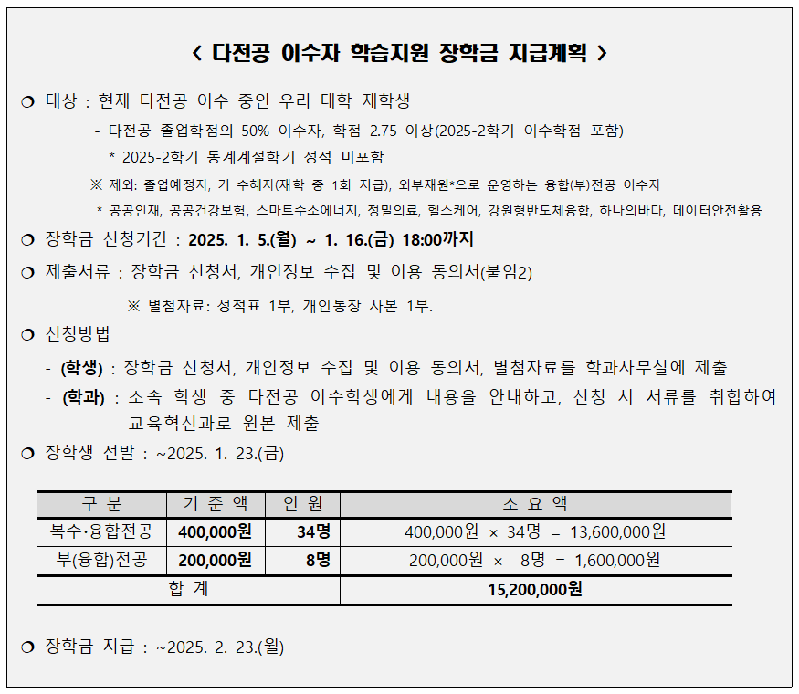 fnctId=bbs,fnctNo=567 [학부] 2025학년도 다전공 이수자 학습지원 장학금 지급 계획 알림 작성일 2026.01.02 작성자 박혜진 조회수 457 첨부파일 (붙임1) 창의융합형 인재 양성을 위한 다전공 학습지원 장학금 지급 계획.hwp (붙임3) 다전공 이수자 학습지원 장학금 신청서 및 개인정보 동의서.hwp (붙임2) 융합전공 이수자 학습지원 장학금 지급계획.hwp