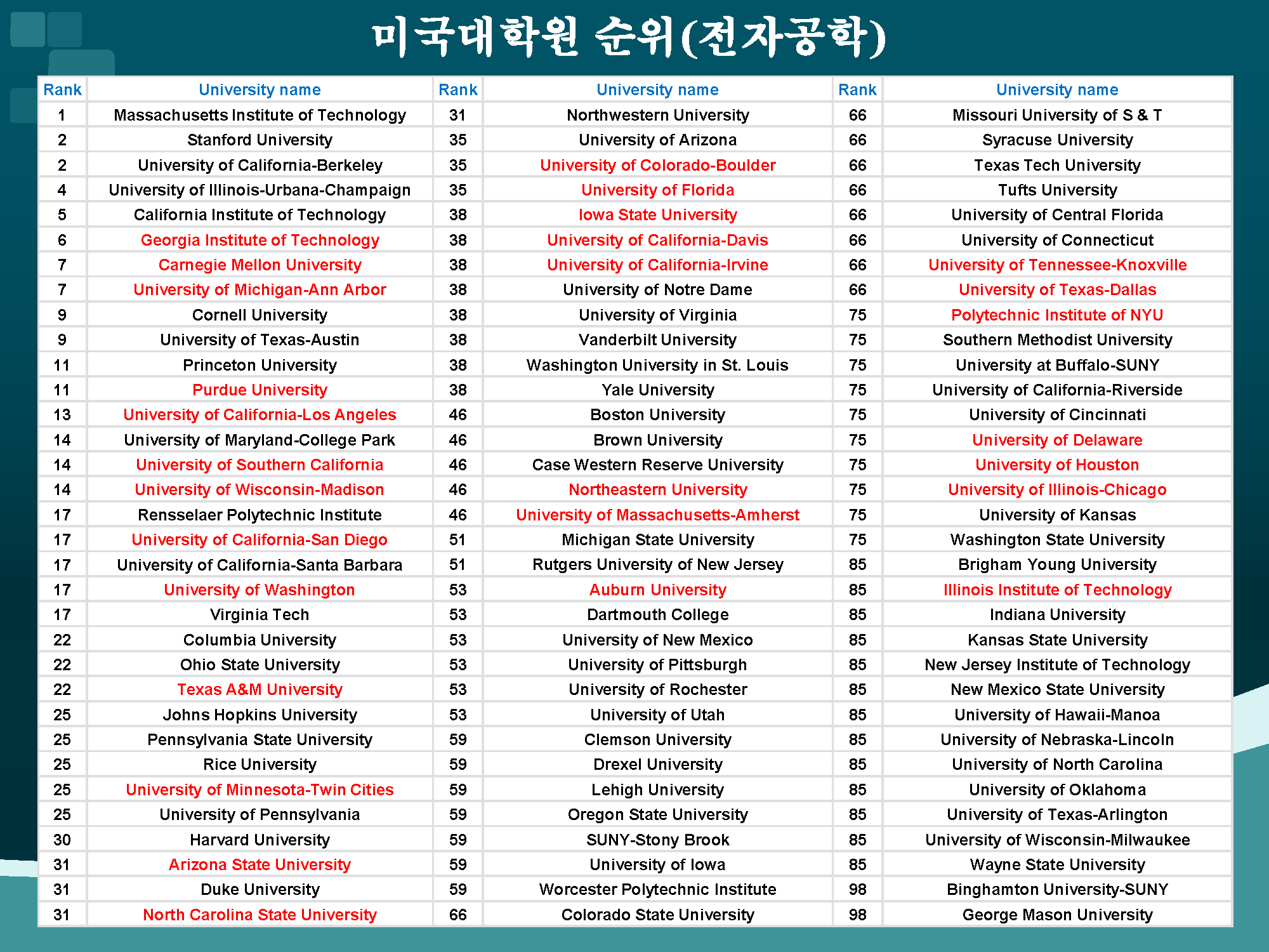 (2017년 합격생: 김해인(12), 이서하(08), 장웅재(09), 박영준(10), 유학동아리(SAC)회원, 조명석 교수, 이상민교수 )2017년 전자공학과 졸업생 미국 명문대학원 합격우리 대학 전자공학과 졸업생 6명이 2016~7년 미국 명문대학원에 합격했다.올해 전자공학과 졸업생 6명이 2016~7년 미국 명문대학원 석‧박사과정에 합격했다. 전자공학과는 1996년 첫 유학생을 배출한 이후 지금까지 총 65명의 졸업생이 미국 명문대학원에 합격했다. 현재도 유학 중인 졸업생들이 미국에서 석‧박사과정에 수학하고 있다. 석‧박사학위 취득 후에는 미국 Intel과 같은 미국 내 기업이나 삼성전자, LG전자와 같은 국내 굴지의 기업에 취업하여 연구원으로 활약하고 있다.전자공학과는 2007년부터는 학과에서 유학동아리(SAC)를 운영하고 있으며, 교수들과의 면담, 유학 선배들과 후배들 간의 교류, 유학 정보 공유 등을 통해 유학을 준비하는 학생들에게 많은 도움을 주고 있다. 전자공학과 미국 명문대학원 합격자 학번이름합격한 미국 대학원학위과정07김영배Illinois Institute of Technology박사과정(연구장학생)08이서하University of Texas at DallasOregon State UniversityKansas State University석사과정09장웅재University of Florida석사과정10박영준University of Florida석사과정10신경근Illinois Institute of Technology석사과정12김해인University of Texas at DallasUniversity of Florida석사과정2020년 전자공학과 졸업생 미국 명문대학원 합격 우리 대학 전자공학과 졸업생 4명(김영준(07학번), 맹수현(11학번), 함서현(15학번), 장한나(15학번))이 올해 미국 명문대학원 석‧박사과정에 합격했다. 우리 대학 전자공학과는 1996년 첫 해외 유학생을 배출한 이후 지금까지 총 69명의 졸업생을 미국 명문대학원에 합격시켰다. 우리 대학 졸업생들은 미국 대학원에서 석 박사 학위를 취득한 후 Intel, Apple, Microsoft 등의 미국 내 대기업이나 삼성전자, LG전자 등 국내 굴지의 기업에 취업해 활약을 펼치고 있다. 2020년 전자공학과 美 명문대학원 합격자 학번이름합격한 미국 대학원학위과정07김영준 University of Massachusetts, Amherst박사과정(연구장학생)11맹수현 Ohio State University Arizona State University University of California, Irvine University of Massachusetts, Amherst석사과정15함서현 Texas A M University University of Florida Iowa State University University of Texas at Dallas University of Delaware Colorado State University석사과정15장한나 University of Texas at Dallas석사과정