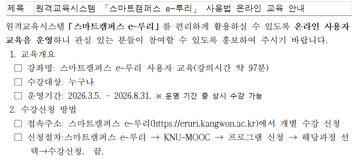 원격교육시스템 「스마트캠퍼스 e-루리」 사용법 온라인 교육 안내