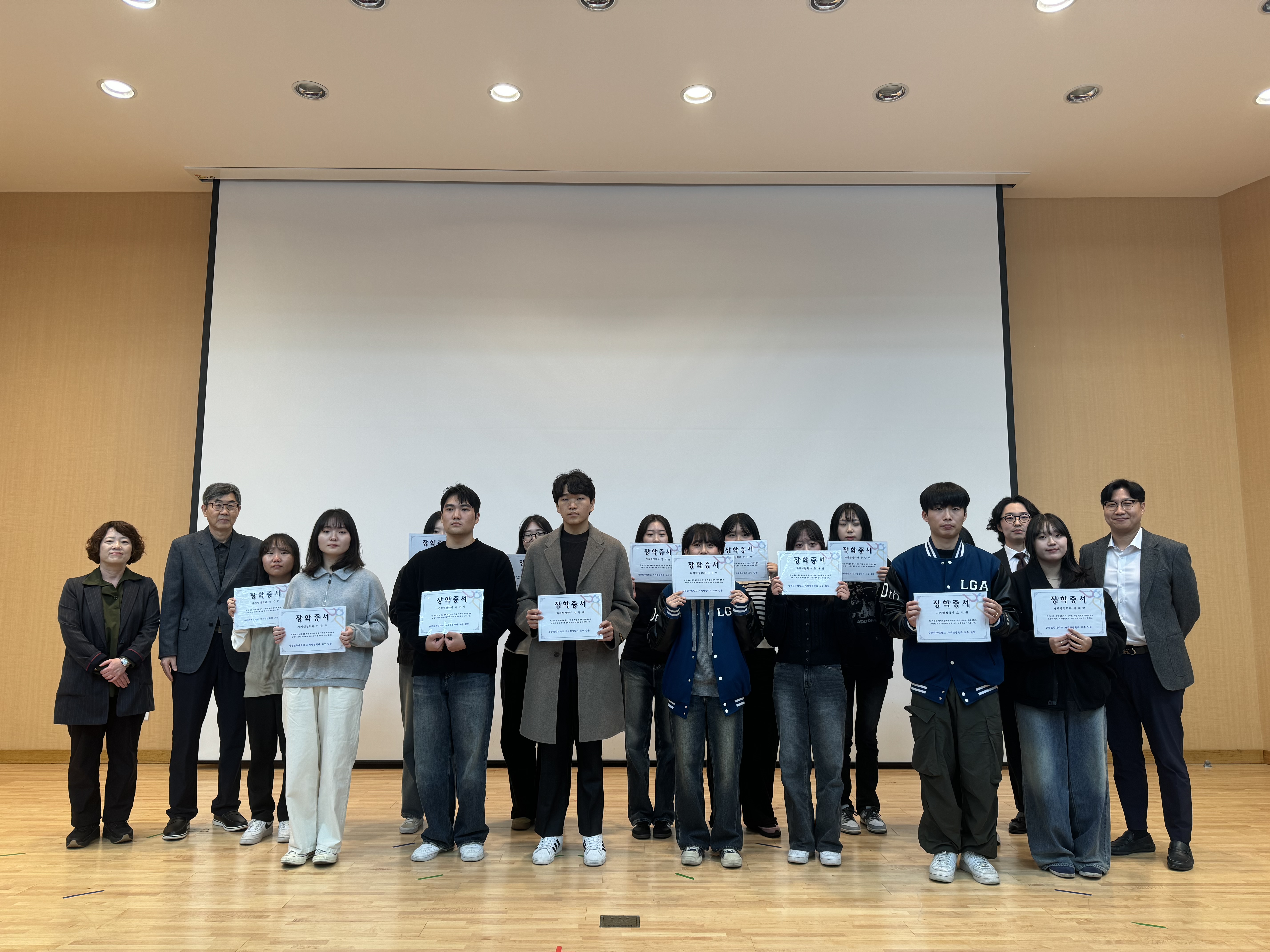 이어 자치행정학과 교수 장학금 수여식을 진행하여 1학년 3명, 2학년 4명, 3학년 4명, 4학년 3명의 학생들이 장학금을 수여받았다.