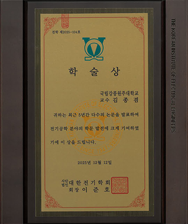 이번 수상은 김종겸 교수의 학문적 성취뿐 아니라, 우리 대학 전기공학과의 연구 역량과 학술적 위상을 대외적으로 다시 한번 확인하는 계기가 되었다.