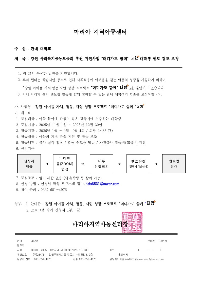 [마리아지역아동센터] 강원 사회복지공동모금회 후원 지원사업 "더디가도 함께" 더함 대학생 멘토 모집