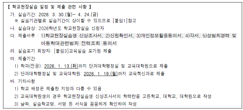 2026학년도 교직과정 이수예정자 학교현장실습 배정 및 서류 제출 안내