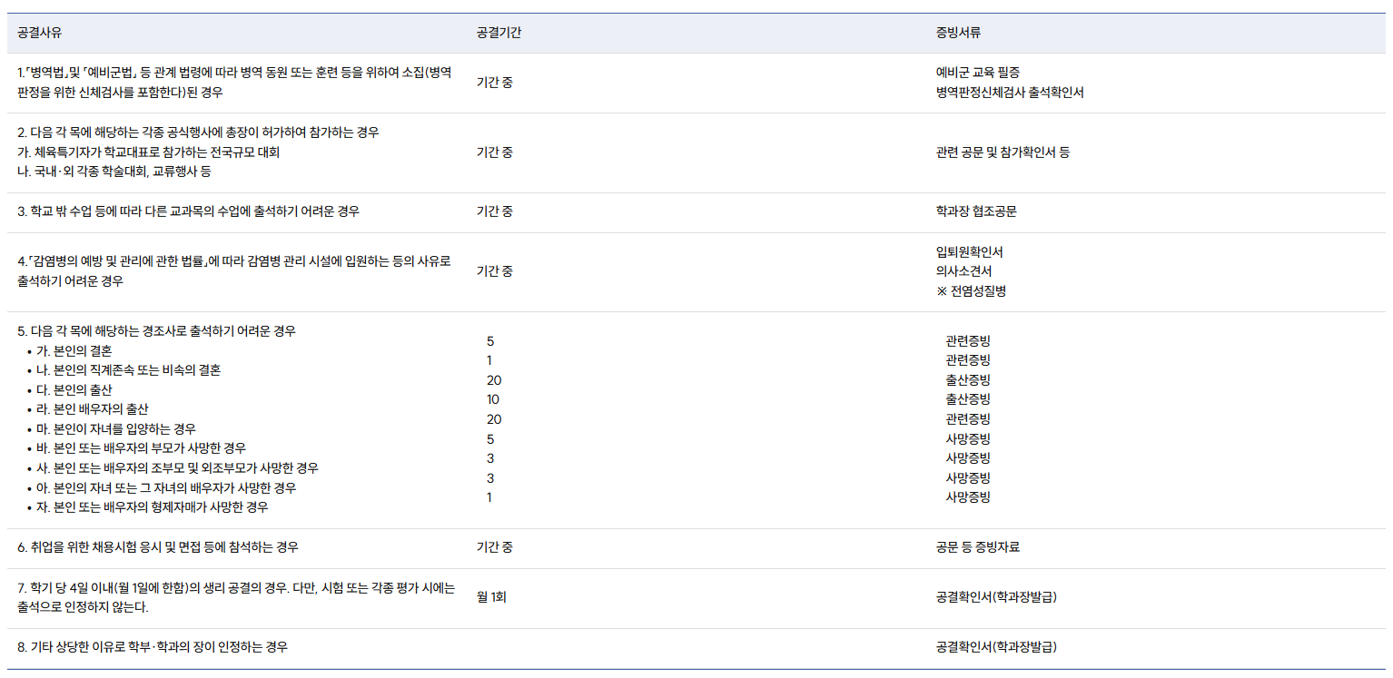 * 관련: 강원대학교 학사운영규정 제 27조(공결)