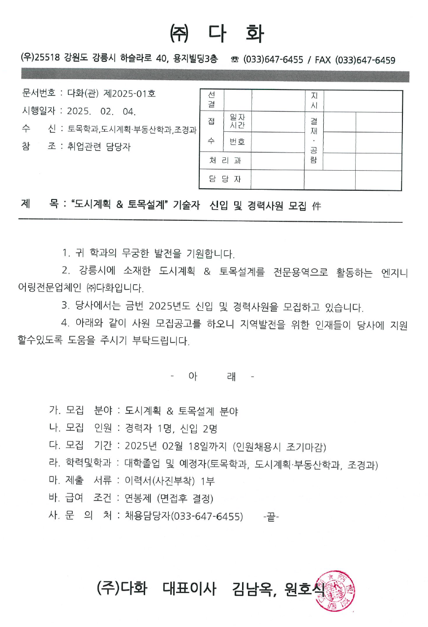 (주)다화 "도시계획&토목설계"기술자 신입 및 경력사업 채용안내