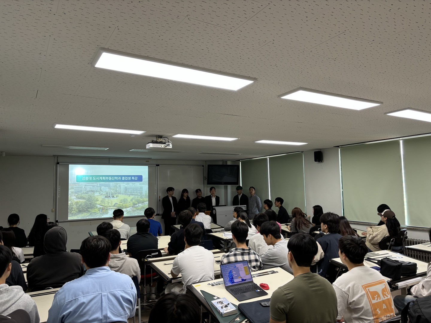 2024년 5월 27일(월), 도시계획·부동산학과에서는 학과 졸업생 동문을 초청하여 동문특강을 개최하였다. 이번 동문특강은 6명의 동문(13학번 정범수-한국토지주택공사, 16학번 전도희-주택도시보증공사, 11학번 강병현 도화엔지니어링, 13학번 김강산-한국종합기술, 15학번 윤태영-경호엔지니어링, 15학번 문준영-삼경)이 참여하였으며 본인들의 취업한 분야에 대한 소개 및 취업정보 및 준비과정 등 재학생들이 정말 알고 싶어하는 내용에 대한 강연을 진행하였다.