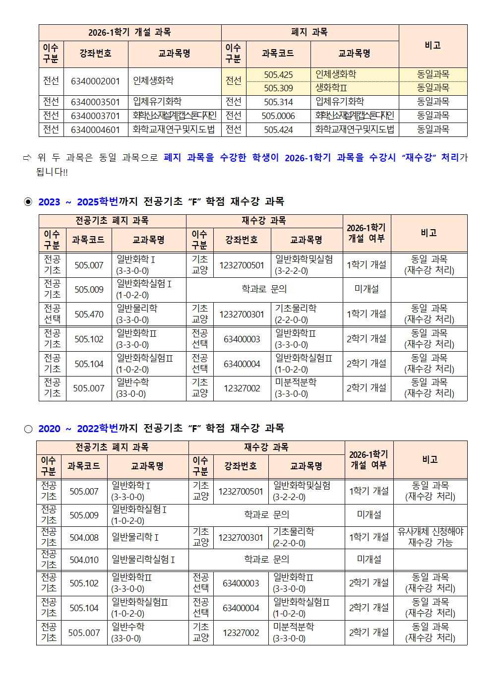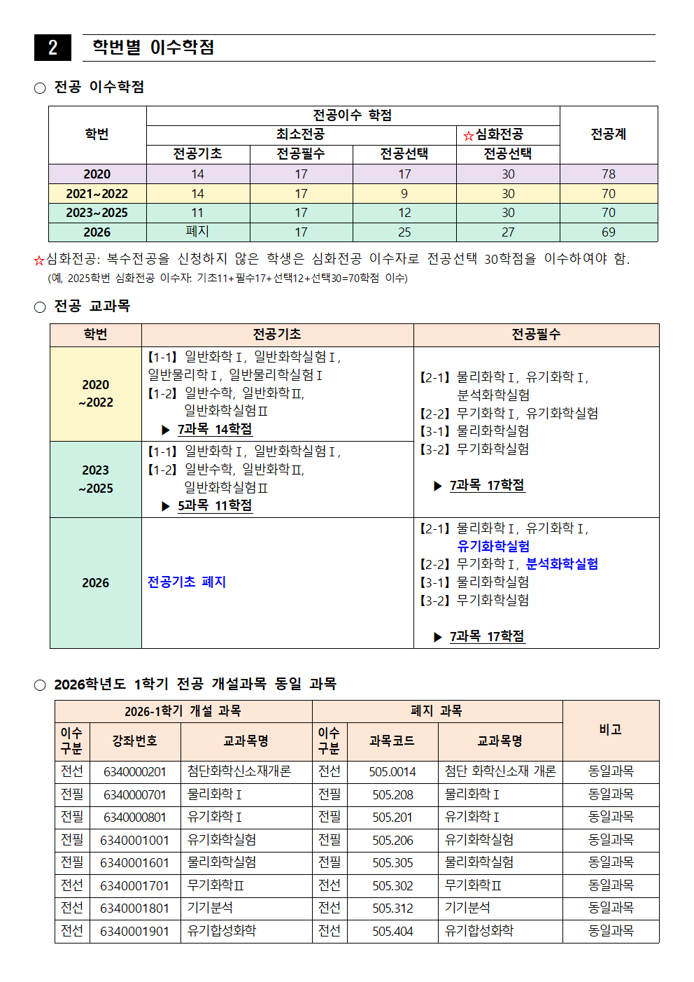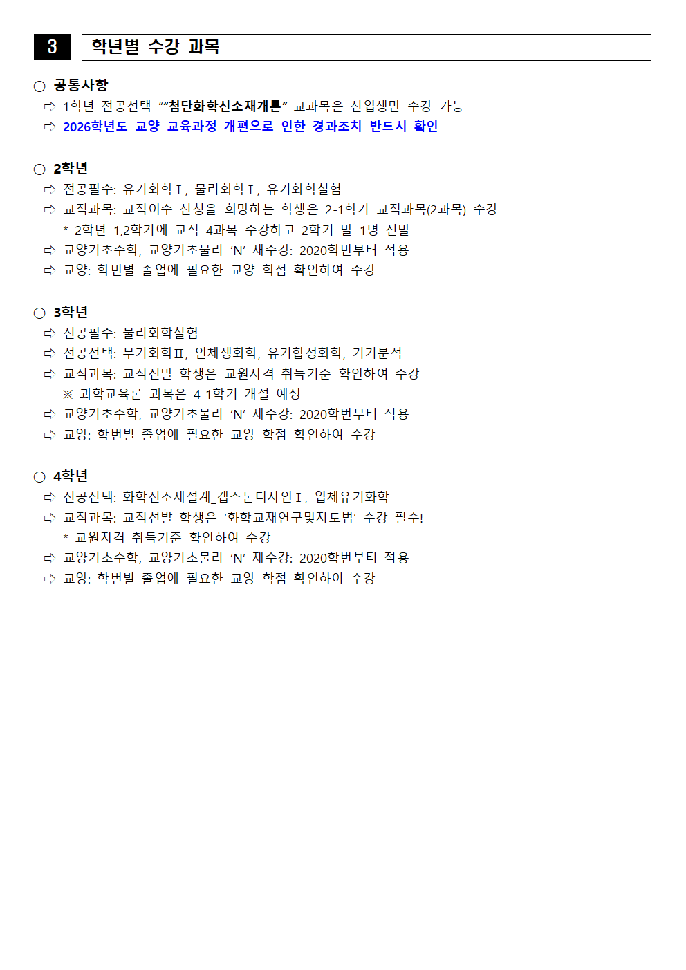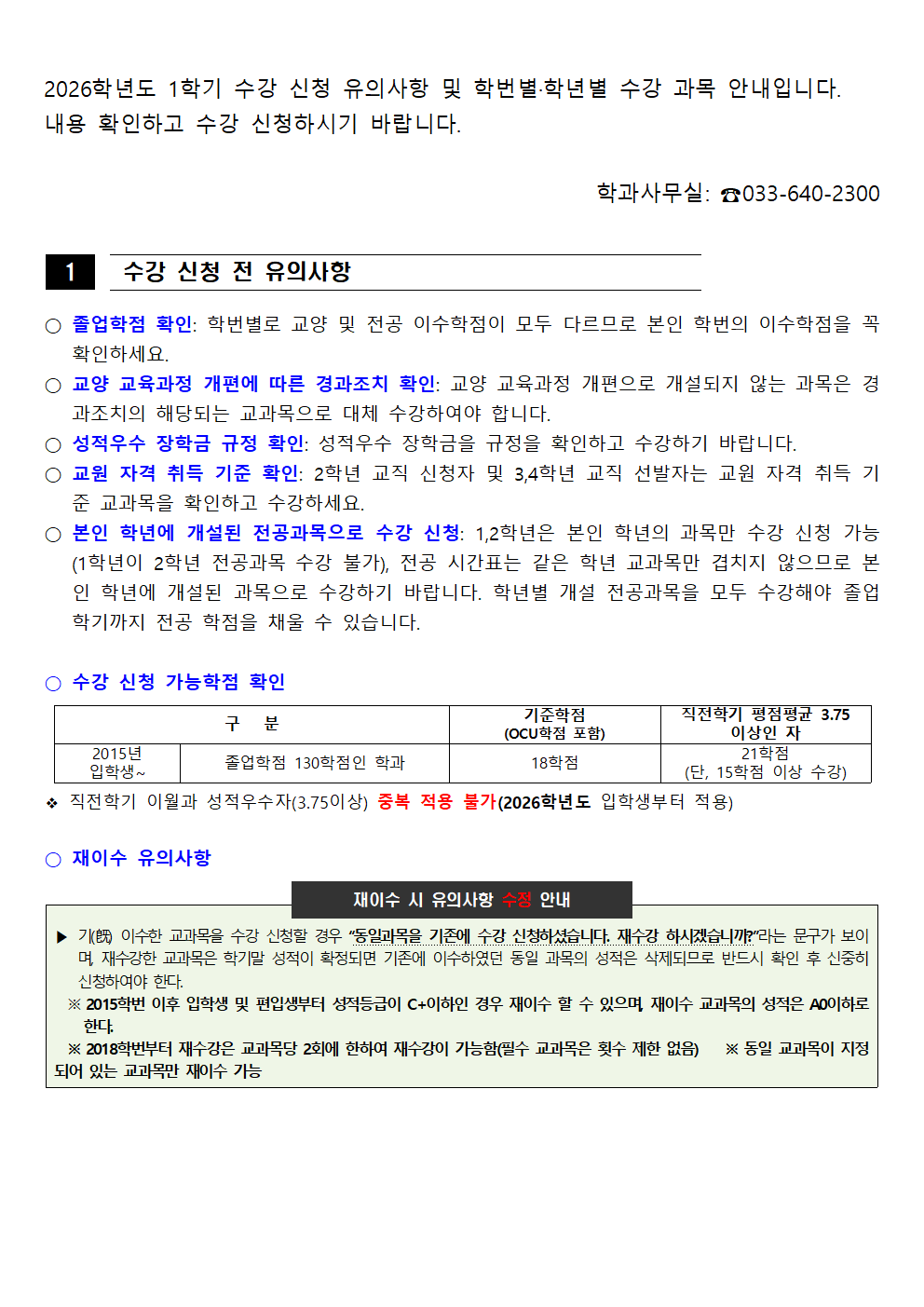 fnctId=bbs,fnctNo=562 [학부] 2026학년도 1학기 학년별 수강학신청 안내 작성일 2026.02.18 작성자 진미영 조회수 453 첨부파일 1. (2020~2025학번) 교육과정 이수기준표.pdf 4. 장학금 규정(학과).pdf 3. (2019~2024학번) 강릉원주대학교 비교과 활동 졸업인증 운영 규정.hwp 0. 2026학년도 1학기 교육과정 수강편람(최종).pdf 2. (교직이수자) 교원자격 무시험검정 합격기준.pdf