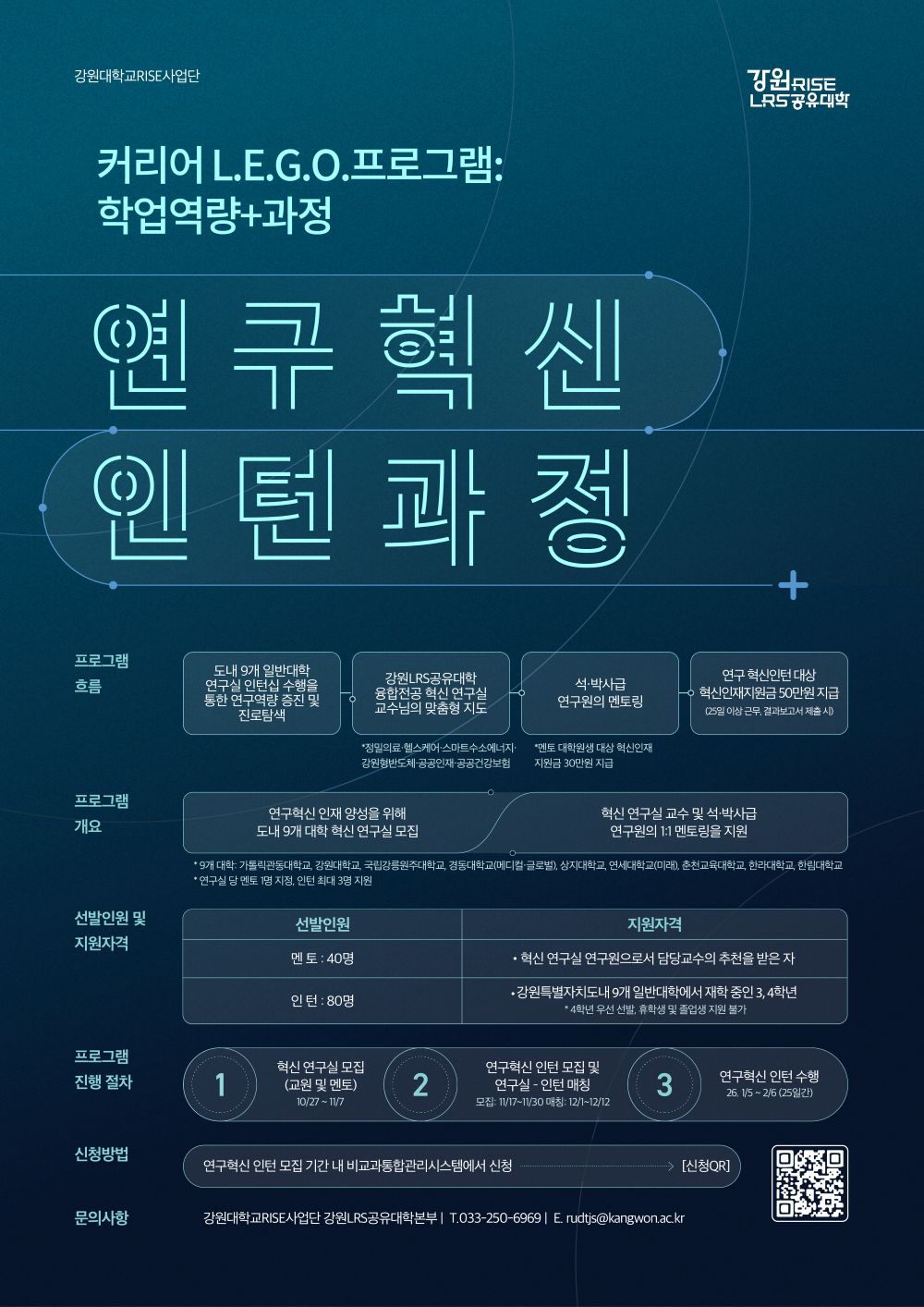 대학원 진학 활성화 및 지역 정주율 향상을 목적으로 연구혁신 인턴 과정을 추진하고 있습니다.