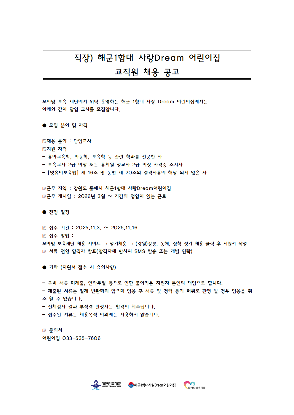 fnctId=bbs,fnctNo=208 해군1함대 사랑Dream 어린이집 교직원 채용 작성일 2025.11.10 작성자 신시원 조회수 653 첨부파일 첨부파일이(가) 없습니다. 다음글 강릉원주대학교 해람어린이집 보육교직원 모집 공고 신시원 2025-11-17 14:27:43.0 이전글 2025학년도 봉대초등학교병설유치원 하계 방학 중 방과후과정 인력 채용 공고 신시원 2025-06-20 09:24:39.0 총 16 개의 게시물이 있습니다. 게시물 검색 제목 작성자 게시글 리스트 취업정보 번호 제목 작성자 작성일 댓글 조회수 첨부파일 16 강원특별자치도자연학습원 직원 공개 채용 신시원 2026.01.12 0 444 1 15 강릉원주대학교 해람어린이집 보육교직원 모집 공고 신시원 2025.11.17 0 890 1 14 해군1함대 사랑Dream 어린이집 교직원 채용 신시원 2025.11.10 0 653 0 13 2025학년도 봉대초등학교병설유치원 하계 방학 중 방과후과정 인력 채용 공고 신시원 2025.06.20 0 2217 0 12 하이원 정선 어린이집(강원랜드 직장어린이집(한솔보육재단)) 보육교사 채용 공고 신시원 2024.07.17 0 5925 0 11 <원주소방서어린이집 담임교사 구인> 신시원 2024.03.11 0 5881 0 10 근로복지공단 동해어린이집 보육교직원 채용 공고 신시원 2023.11.24 0 4105 0 9 푸른자연 유치원 교사 구인 안내 신시원 2023.08.14 0 1791 0 8 2023년 강릉원주대학교 해람어린이집 교사 채용공고 신시원 2022.12.14 0 2268 2 7 근로복지공단 동해어린이집 보육교사 채용 공고 신시원 2022.11.23 0 2297 0 처음 12 1 2 다음 페이지 끝