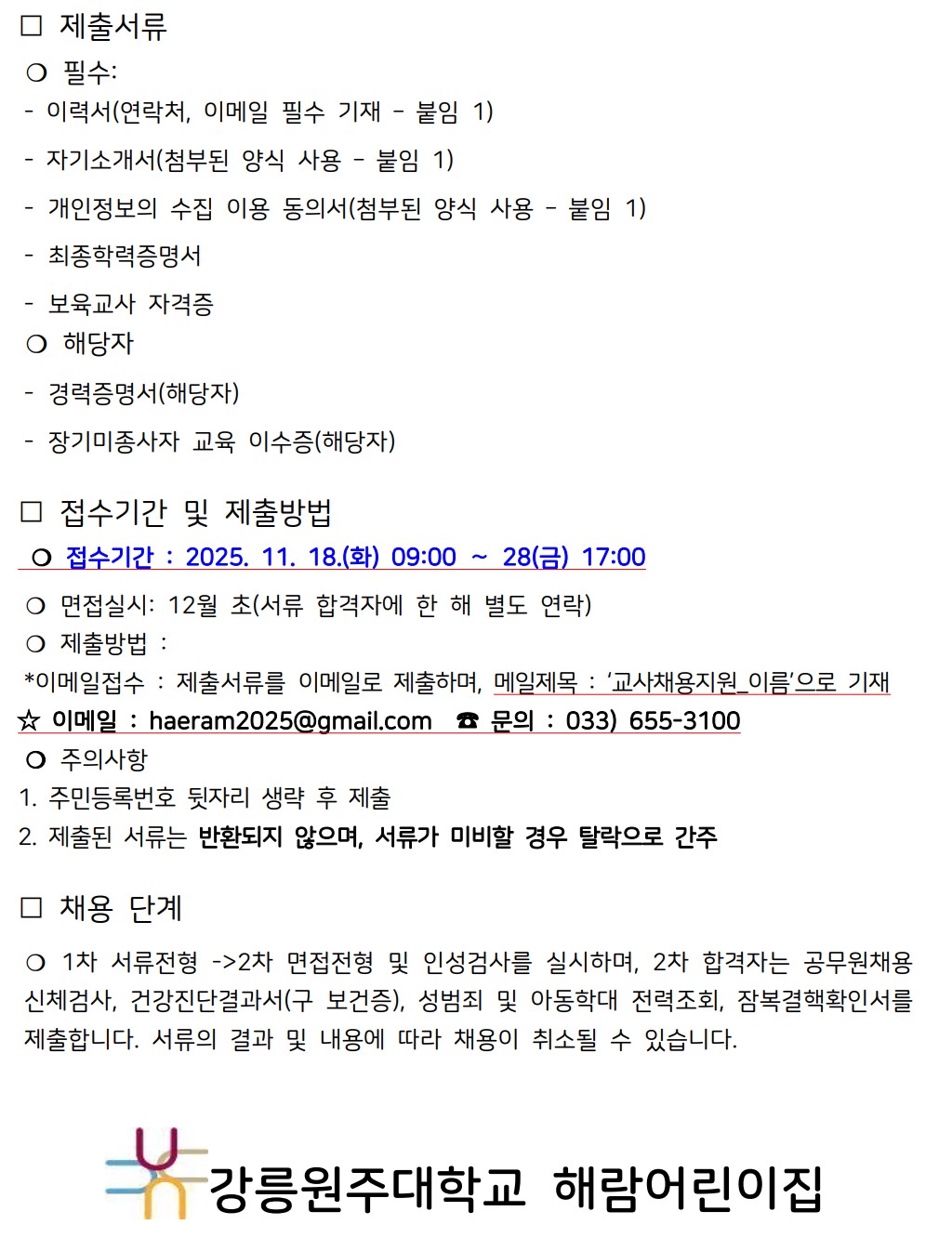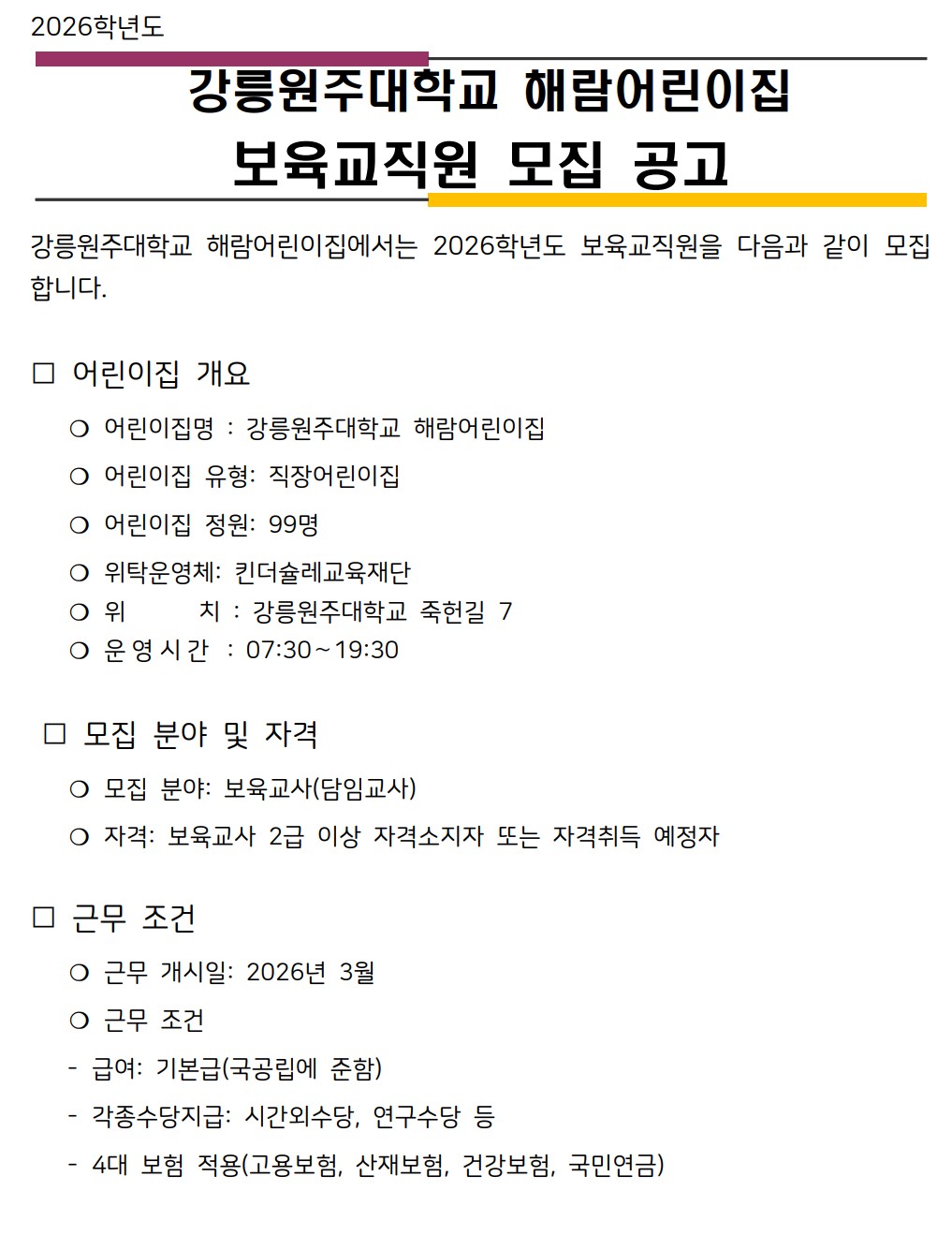 fnctId=bbs,fnctNo=208 강릉원주대학교 해람어린이집 보육교직원 모집 공고 작성일 2025.11.17 작성자 신시원 조회수 891 첨부파일 해람_교사채용지원양식.hwp 다음글 강원특별자치도자연학습원 직원 공개 채용 신시원 2026-01-12 10:57:21.0 이전글 해군1함대 사랑Dream 어린이집 교직원 채용 신시원 2025-11-10 14:40:03.0 총 16 개의 게시물이 있습니다. 게시물 검색 제목 작성자 게시글 리스트 취업정보 번호 제목 작성자 작성일 댓글 조회수 첨부파일 16 강원특별자치도자연학습원 직원 공개 채용 신시원 2026.01.12 0 444 1 15 강릉원주대학교 해람어린이집 보육교직원 모집 공고 신시원 2025.11.17 0 891 1 14 해군1함대 사랑Dream 어린이집 교직원 채용 신시원 2025.11.10 0 653 0 13 2025학년도 봉대초등학교병설유치원 하계 방학 중 방과후과정 인력 채용 공고 신시원 2025.06.20 0 2218 0 12 하이원 정선 어린이집(강원랜드 직장어린이집(한솔보육재단)) 보육교사 채용 공고 신시원 2024.07.17 0 5925 0 11 <원주소방서어린이집 담임교사 구인> 신시원 2024.03.11 0 5881 0 10 근로복지공단 동해어린이집 보육교직원 채용 공고 신시원 2023.11.24 0 4105 0 9 푸른자연 유치원 교사 구인 안내 신시원 2023.08.14 0 1791 0 8 2023년 강릉원주대학교 해람어린이집 교사 채용공고 신시원 2022.12.14 0 2268 2 7 근로복지공단 동해어린이집 보육교사 채용 공고 신시원 2022.11.23 0 2297 0 처음 12 1 2 다음 페이지 끝