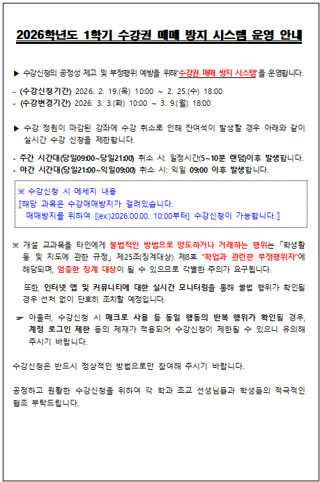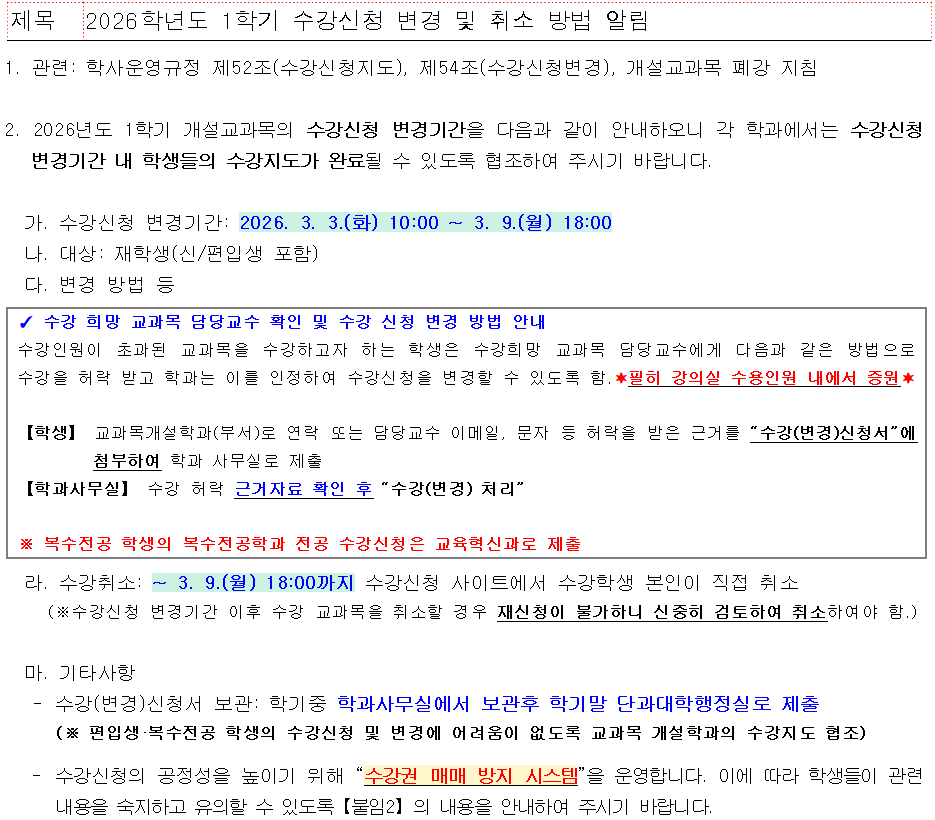 fnctId=bbs,fnctNo=880 2026학년도 1학기 수강신청 변경 및 취소 방법 알림 작성일 2026.02.26 작성자 홍승연 조회수 280 첨부파일 첨부파일이(가) 없습니다.
