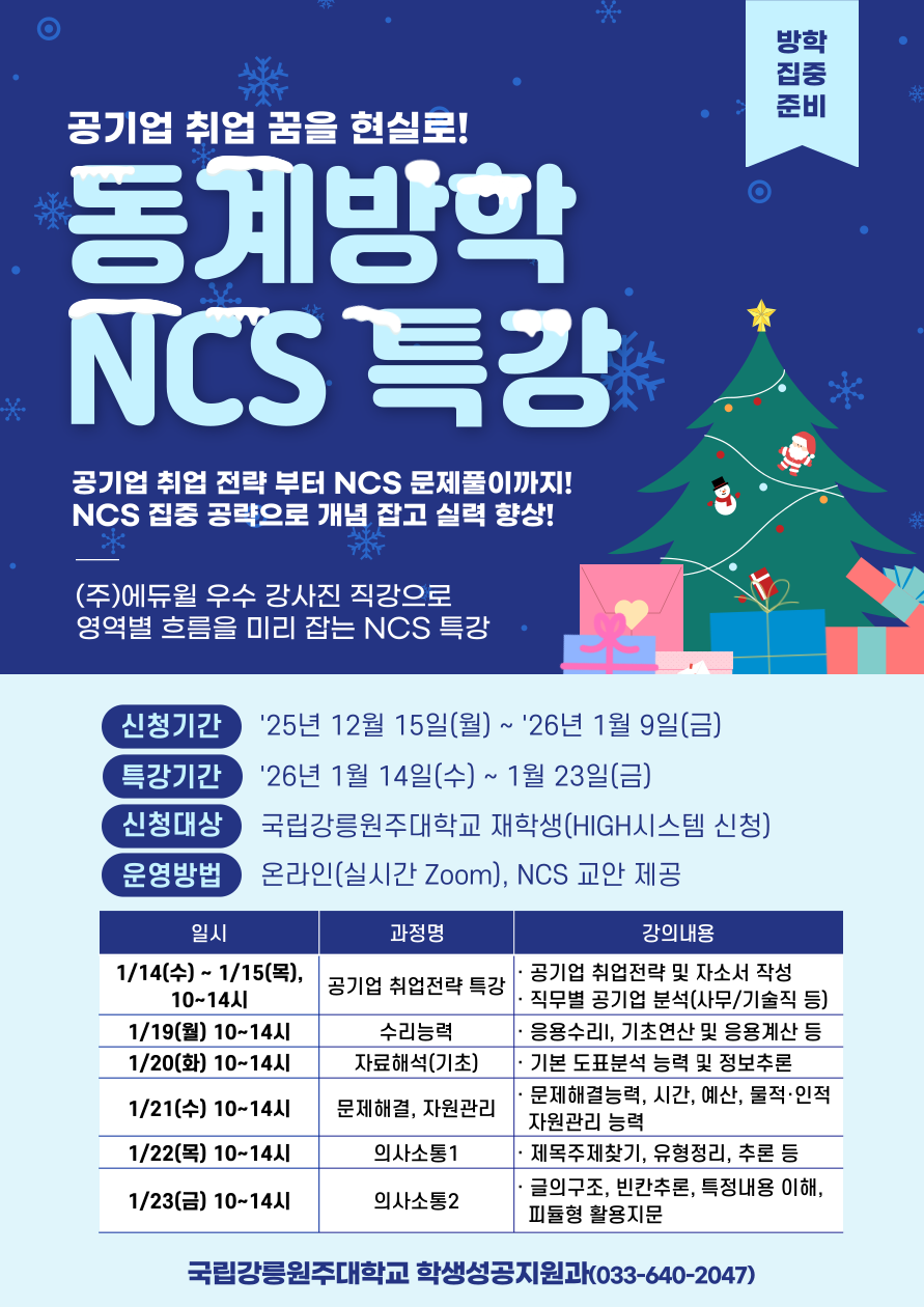 fnctId=bbs,fnctNo=871 [학생성공지원과] 동계방학 공기업 NCS 직업기초능력 향상 프로그램 작성일 2025.12.15 작성자 최지은 조회수 369 첨부파일 첨부파일이(가) 없습니다.