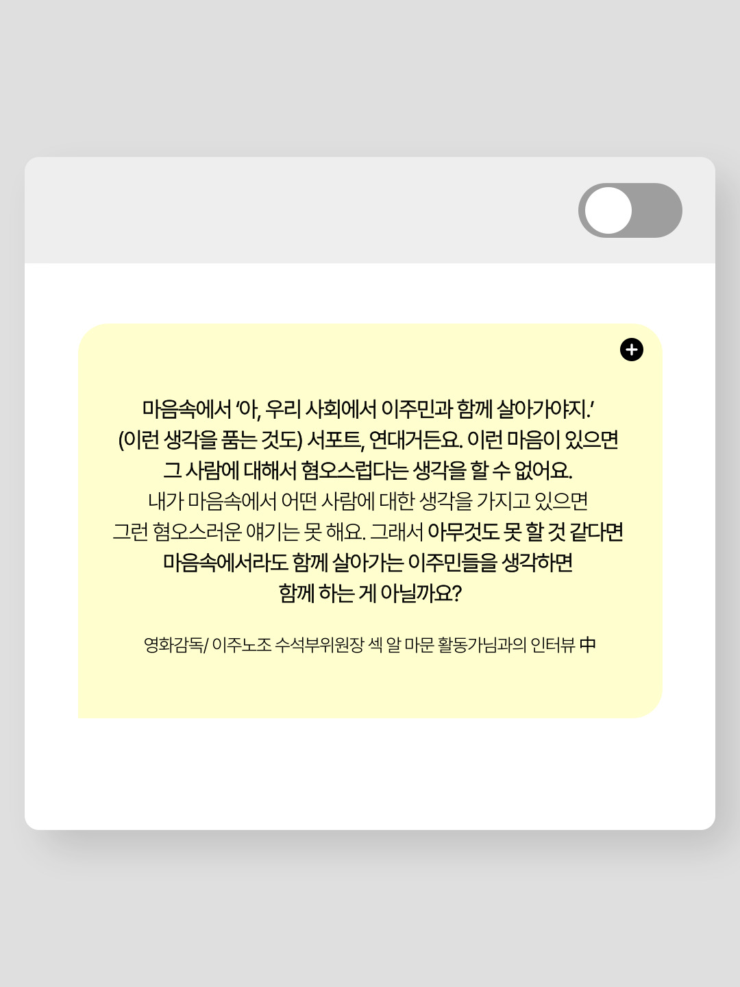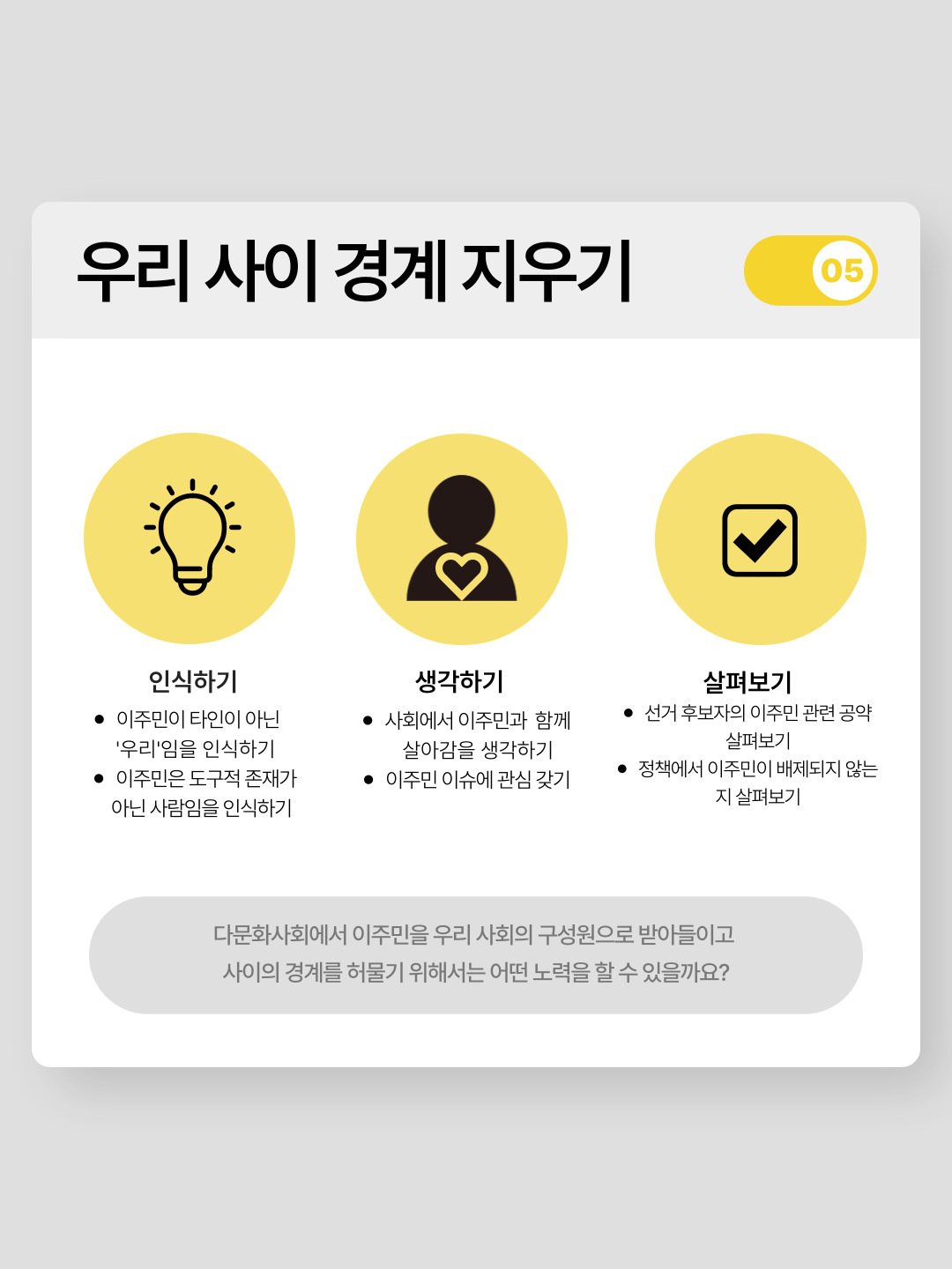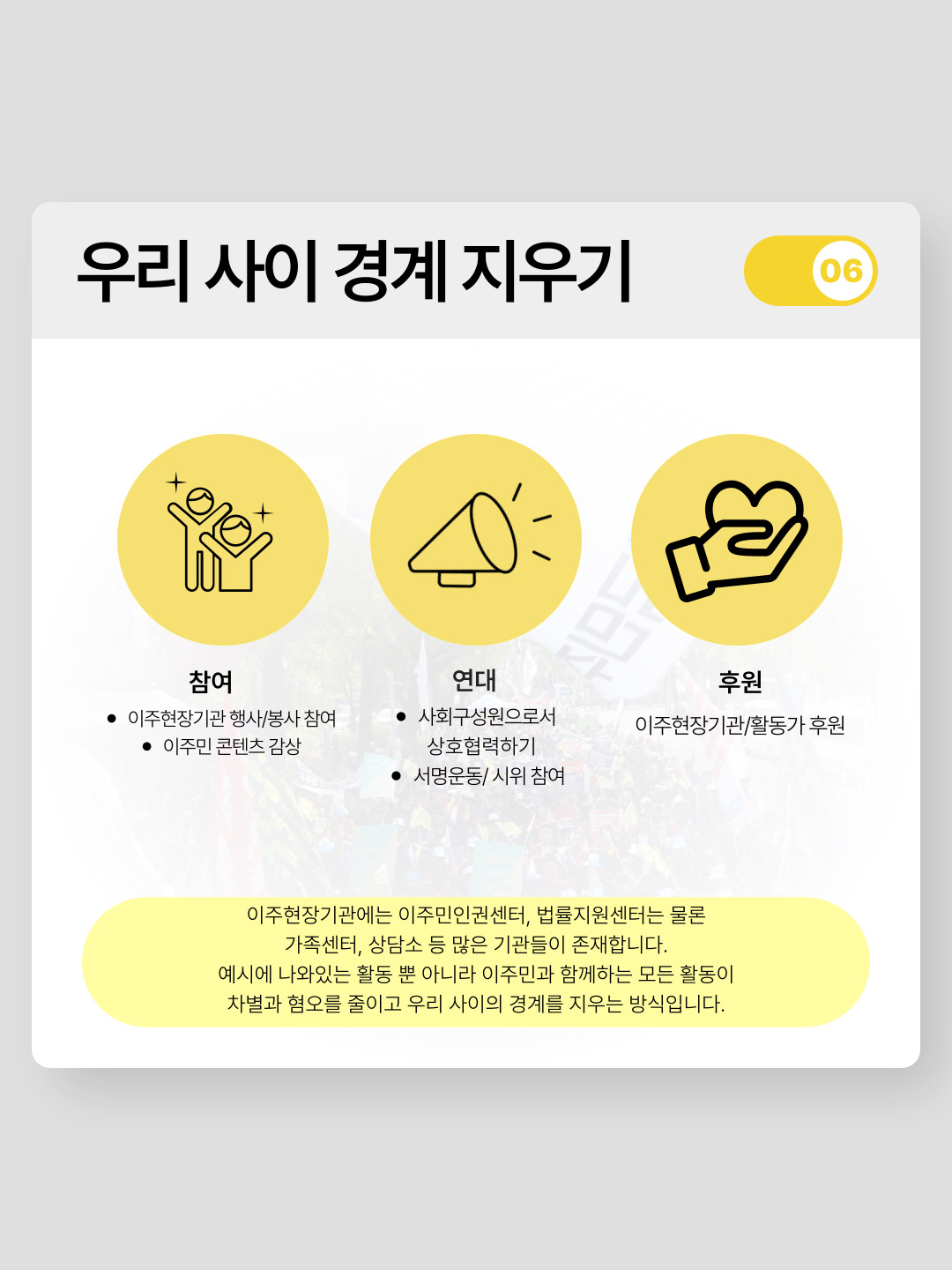강의내용과, 활동가 인터뷰, 강연을 바탕으로 이주민과 공존하는 방법에 대한 카드뉴스를 제작하였습니다