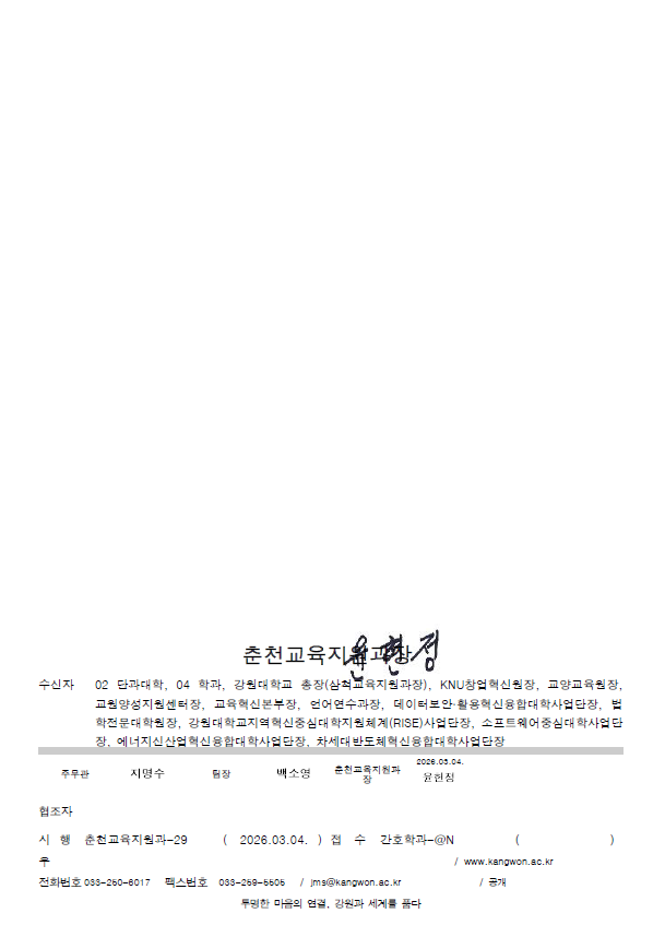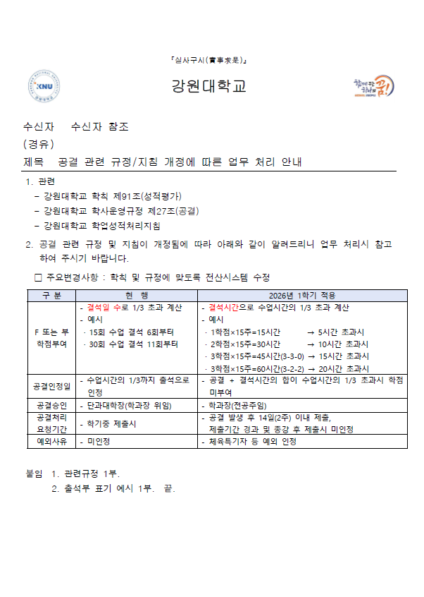 fnctId=bbs,fnctNo=840 공결 관련 규정 및 지침 개정에 따른 공결 제출 절차 안내(서식 포함) 사항입니다. 작성일 2026.03.04 작성자 원민정 조회수 67 공결 관련 규정 및 지침 개정에 따른 공결 제출 절차 안내(서식 포함) 사항입니다. 주요변경사항 확인 바랍니다. 첨부파일 공결 관련 규정_지침 개정에 따른 업무 처리 안내.pdf 1.공결관련규정.hwp 출석부표기예시.hwp