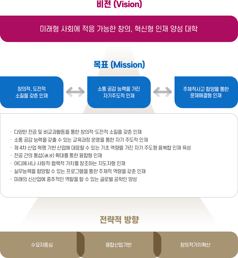 학문 분야 간의 긴밀한 연계성이 높아지면서 기초과학과 이를 응용하는 응용과학 및 공학과의 경계는 점차 사라지고 있습니다. 이러한 새로운 시대의 요구에 부응하기 위해 과학기술대학은 기초과학을 응용기술에 접목하는 실용적 학문 분야에서 다양한 프로그램 운영을 추구하고자 합니다. 또한 이를 바탕으로 21세기의 지식정보화사회에 지역 산업 경쟁력의 원천이 되는 우수한 창의적 인재양성을 위해 문제 해결 능력을 배양하는 자기 주도적 학습 교육을 통한 4차 산업형 인재 인재를 배출하고자 합니다.