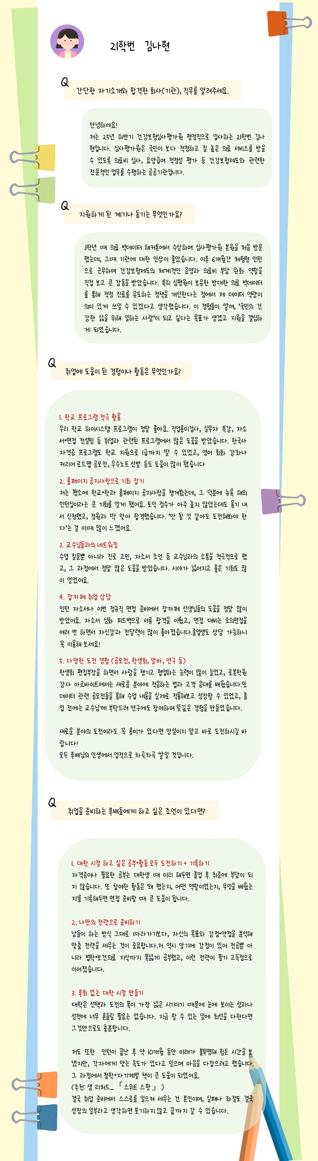 fnctId=bbs,fnctNo=242 [선배들의 취업 스토리] 21학번 김나현 졸업생 (건강보험심사평가원) 작성일 2025.12.11 작성자 데이터사이언스학과 조회수 505 “취업 고민하는 후배들을 위한 선배들의 진짜 조언” “취업 준비? 선배들의 경험담에서 답을 찾아보세요 :)” 첨부파일 첨부파일이(가) 없습니다.