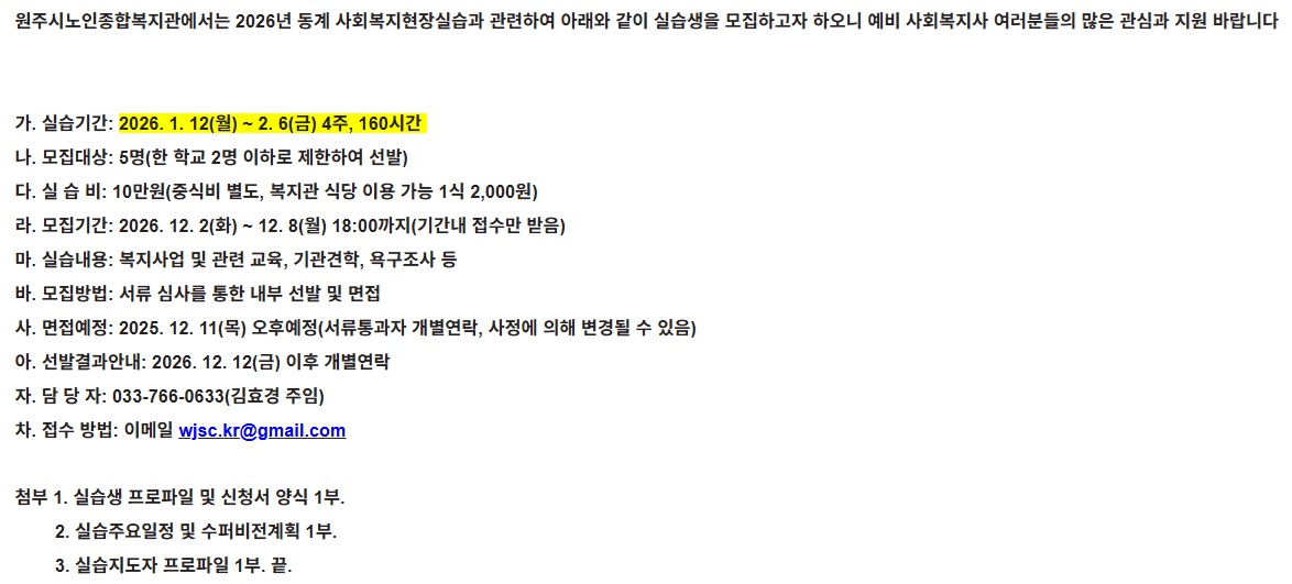 fnctId=bbs,fnctNo=849 [2026-동계] 원주시노인종합복지관 실습생 모집 안내(~12/8) 작성일 2025.11.28 작성자 박아름 조회수 440 첨부파일 원주시노인종합복지관 2026년 동계 사회복지현장실습 첨부파일.hwp